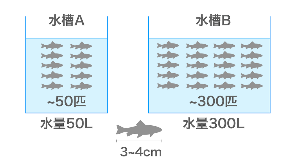 下表は、水槽サイズ(水量)に適した生体数を示している。